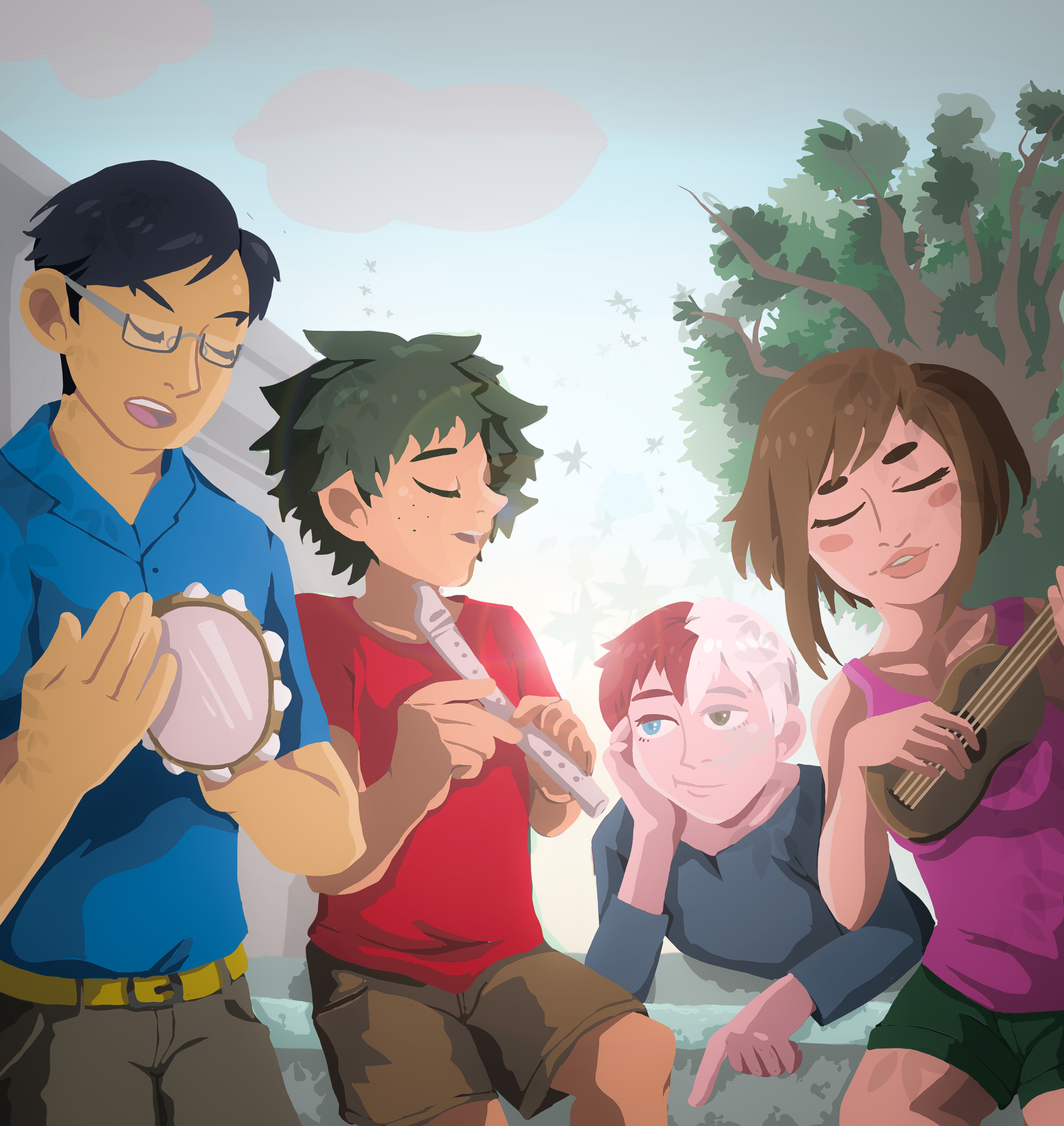 He has no idea what they’re playing, maybe some nursery rhyme he never had the good fortune of being raised on, or something simple out of a lesson book, but if he had to put money on it he’d guess they’re all improvising. Uraraka plays chords on the ukulele in her hands with a level experience he had no idea she had. He can tell from their hours studying applied theory and learning how to recognize chords that she’s playing simple progressions, I-IV-V-I, something they can easily follow. Iida’s tambourine beat is steady and precise. Tsuyu’s experience with jazz gives her the ability to throw embellishments and arpeggios on top of the chords, making them more interesting. Izuku and his recorder add a melody on top of the light backgrounds that give it direction and phrasing.