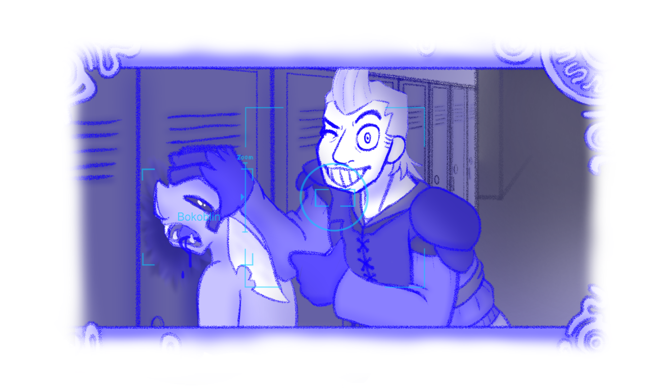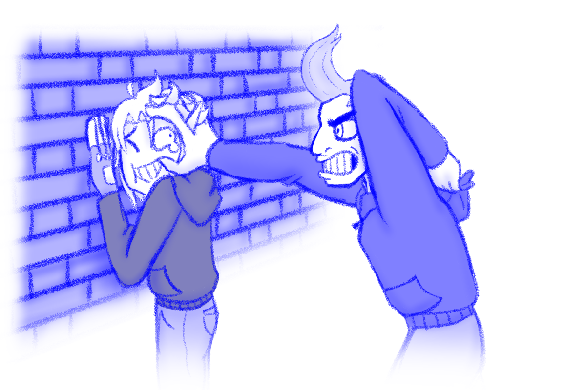 I glanced around the corner to see a trio of people at another set of lockers. What I saw was a classic sight in any good cheesy high school film: a big buff bully harassing a pair of nerds. It looked like he was trying to get homework to copy off of or something. Unfortunately, I happened to be pretty tight with the nerds in question.
