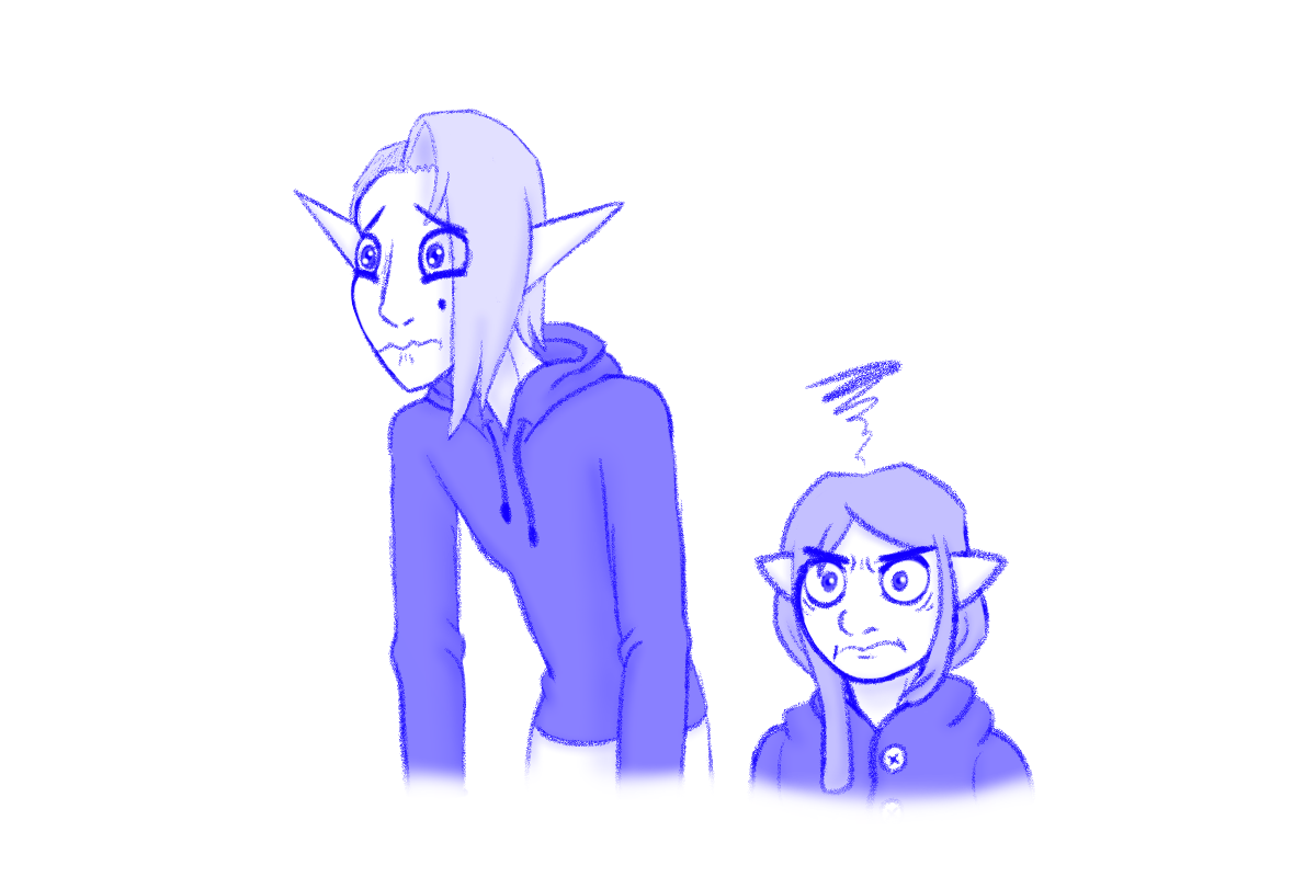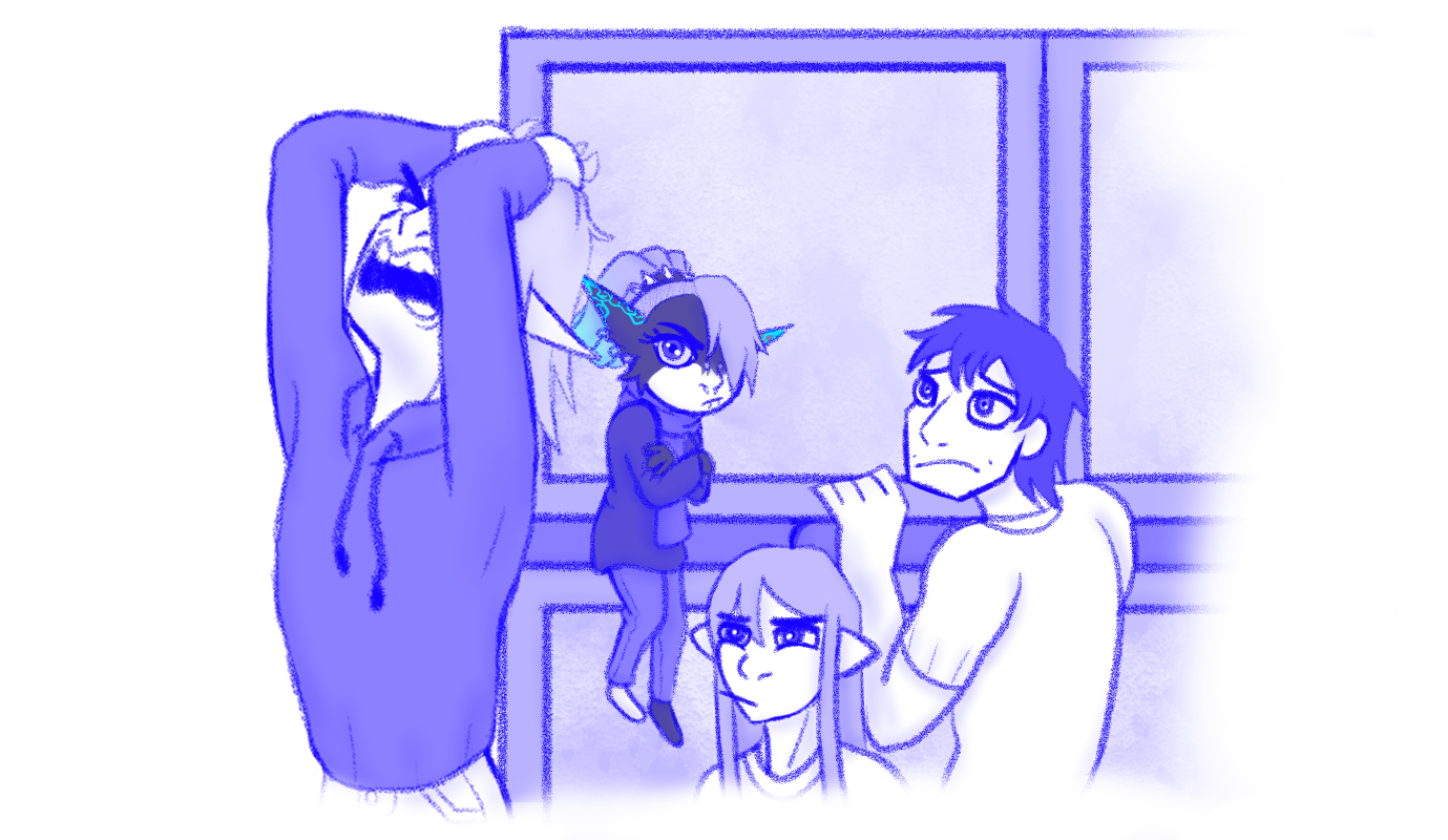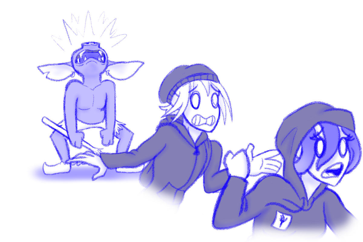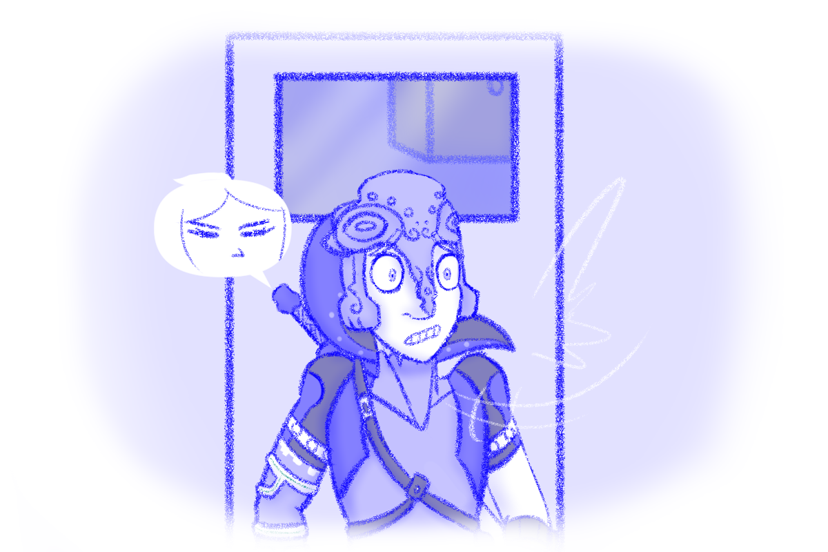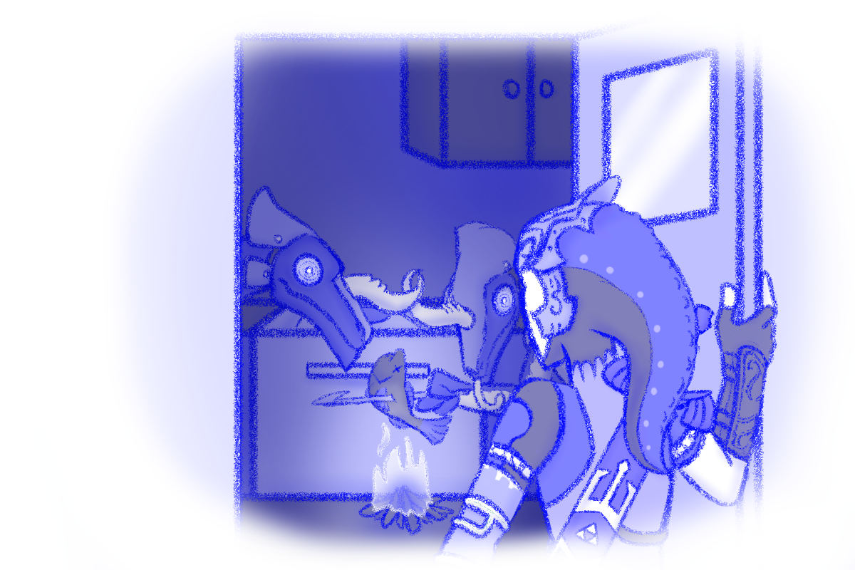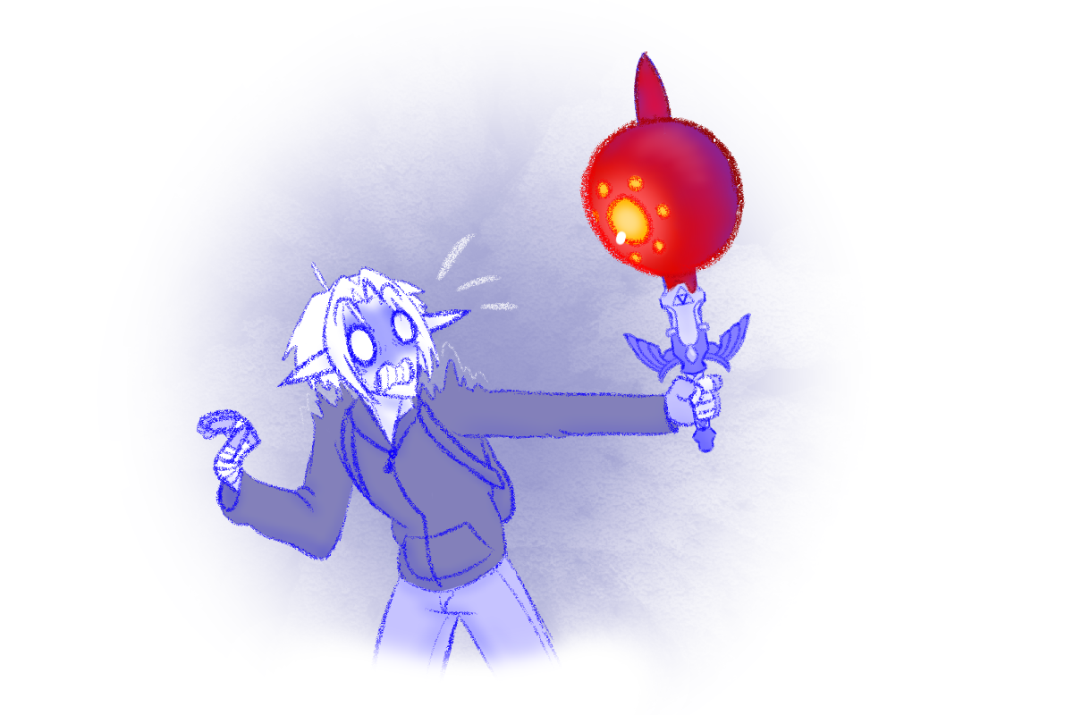 “Guys STOP!” She shouted it loud enough for them all to immediately skid to a stop. For a brief and fearful moment, they wondered what Navi had spotted that was so startling. More monsters? Bigger monsters? Miranda couldn’t help but fear that the big moblin they saw in the school quad was back, but as the shadow slinked around to get a better look at the sight in front of them, she didn’t feel fear. It was fear… and annoyance.