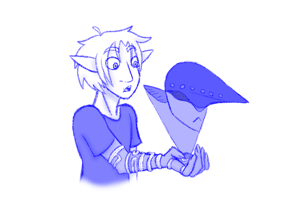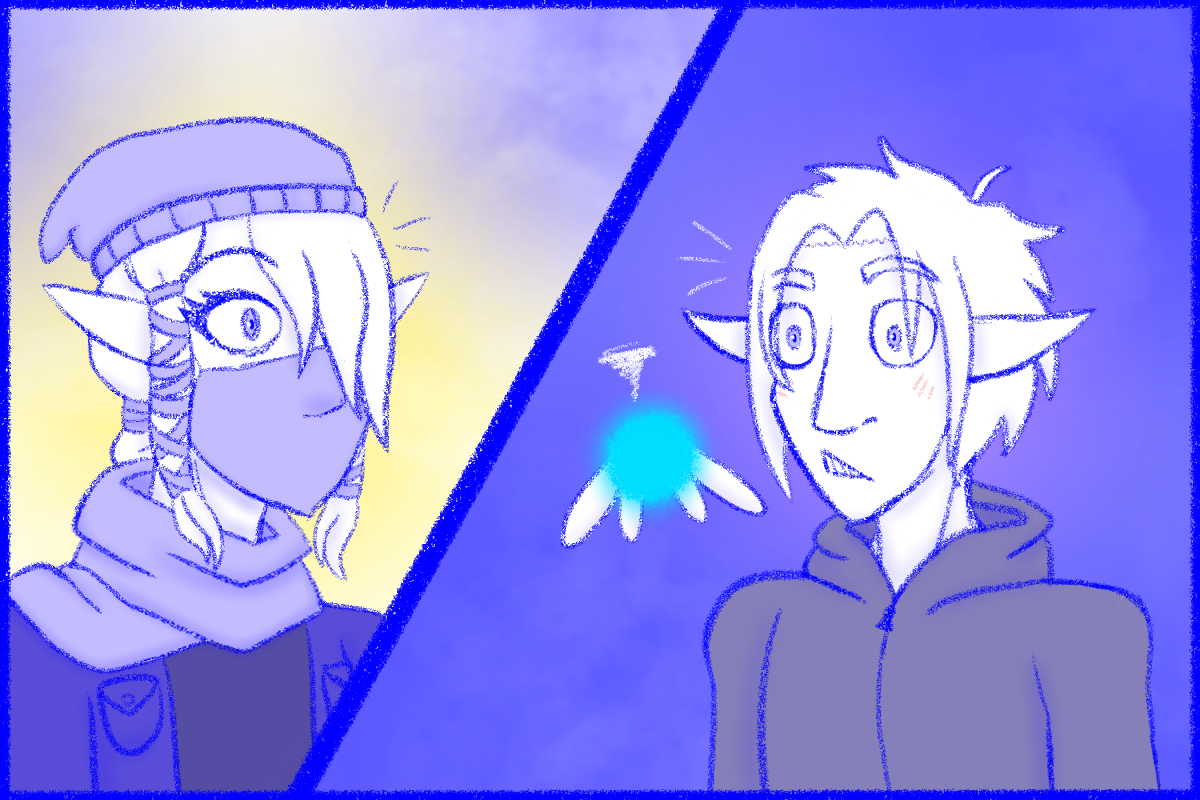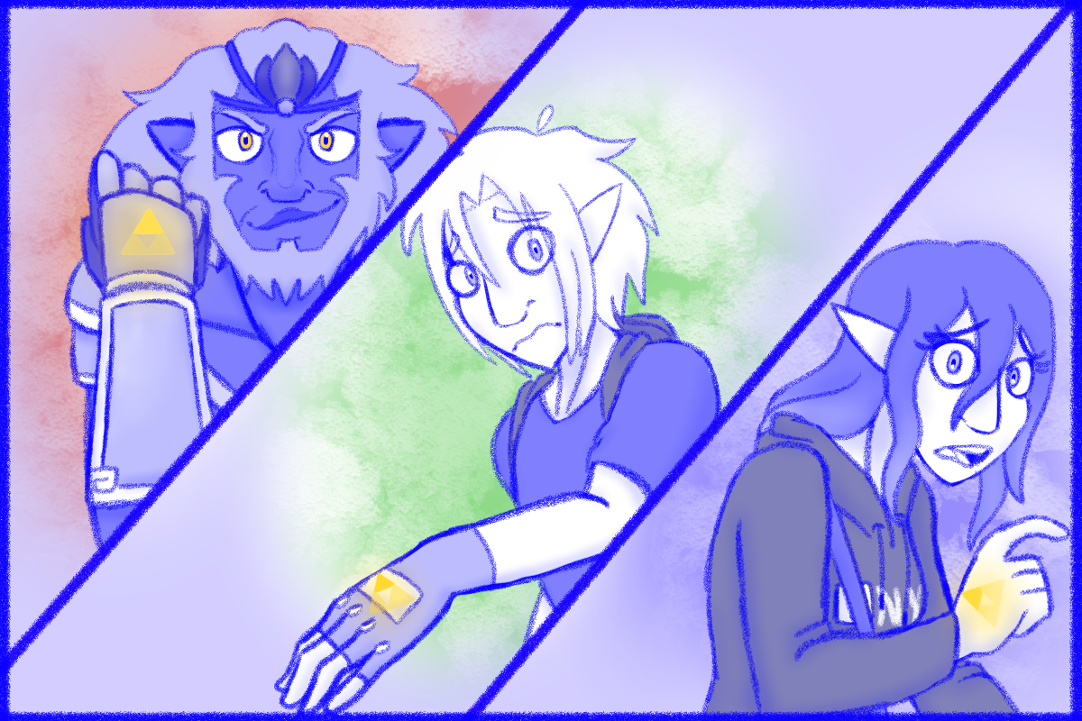 “Link? LINK!” she shot up and sat back down again at Link’s side, turning him over to try and see if he was okay. The hit on the head knocked him out cold. “No no no, you’re okay, you’re fine, wake up!” Sheik tried to rouse him back awake, shaking his shoulder the way people do when they want to wake someone in the morning. It wasn’t working. Not that she had much time to try. She was shocked into stopping when something bright suddenly flashed in her face, illuminating the both of them.