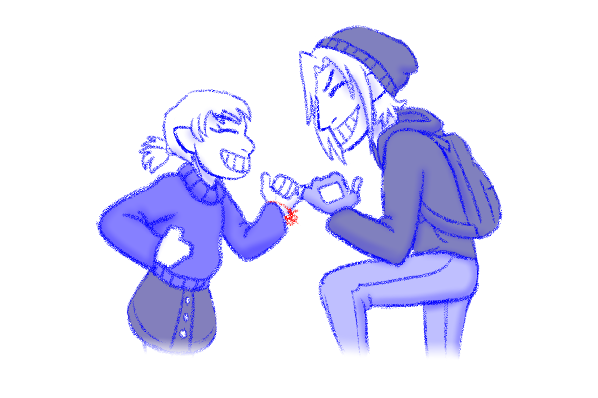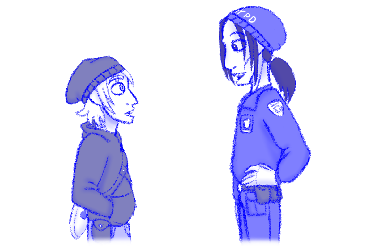 “Oh! That reminds me!” She bent down to get something out of her bag. For a whole moment I only had a view of the patches and hand-painted designs on the back of her denim jacket before she came back up and showed me what she was looking for. “I finally got around to making some decent pencil sketches for my presentation! They started out more crude than some of the other stuff I’ve done for class, but I’m feeling proud of these ones!”