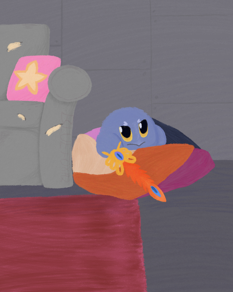 Kirby gently pushed their way past Meta, and flopped down by Fluff’s side. Meta flopped down beside the pink puff, and resumed their furious crayon scribbling on their paper.