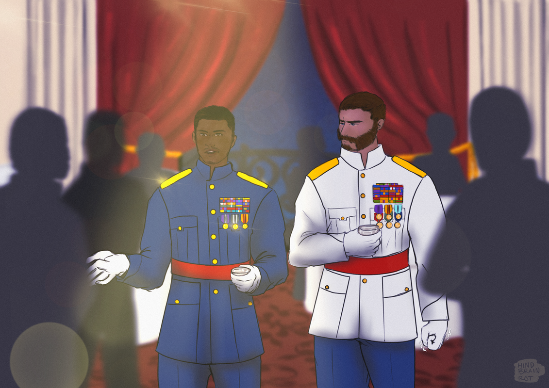 There’s already a large crowd congregating in the center of the room, decorated ladies and gentlemen of the service gathered in conversational circles. Event workers dressed in neat tuxedos to distinguish them from the guests roam the hall, some with trays of little appetizers and others with trays of drinks. A worker makes their way towards Gaz and Price, offering a tray of drinks towards the pair to which both of them gratefully accept a glass. Price sniffs the contents of the instrument in his hand, and he wrinkles his nose. “Alcohol,” he reports. “Champagne.” Give him a whiskey or a bourbon over cheap champagne any day.