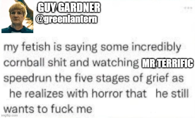 “You, uh.” Guy feels like somebody thumped him, hard, right between the eyes. “You think Terrific’s looking to get laid tonight?”