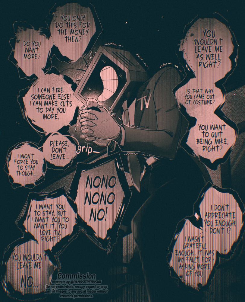 “I know you’ve waited for this but… please don’t hurt them!” The TV shrunk to half his size and got on his knees. “I can’t give them to you… they’re just a child. They’re my kid… I can’t let you take their soul. Anyone but them.” He pleaded.