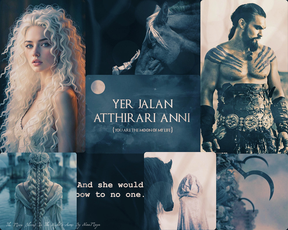 “Very well.” Her delicate hands moved to let the hood down. A shock of white hair streaked with black strands tumbled down her shoulders. She looked like the moon in a starry night. Drogo could hardly resist the urge to move away the mantle of wild hair to have a look at her eyes. She lifted her head and, there were her eyes—enormous, captivating eyes of a deep, rich green that made him think of the Dothraki Sea.